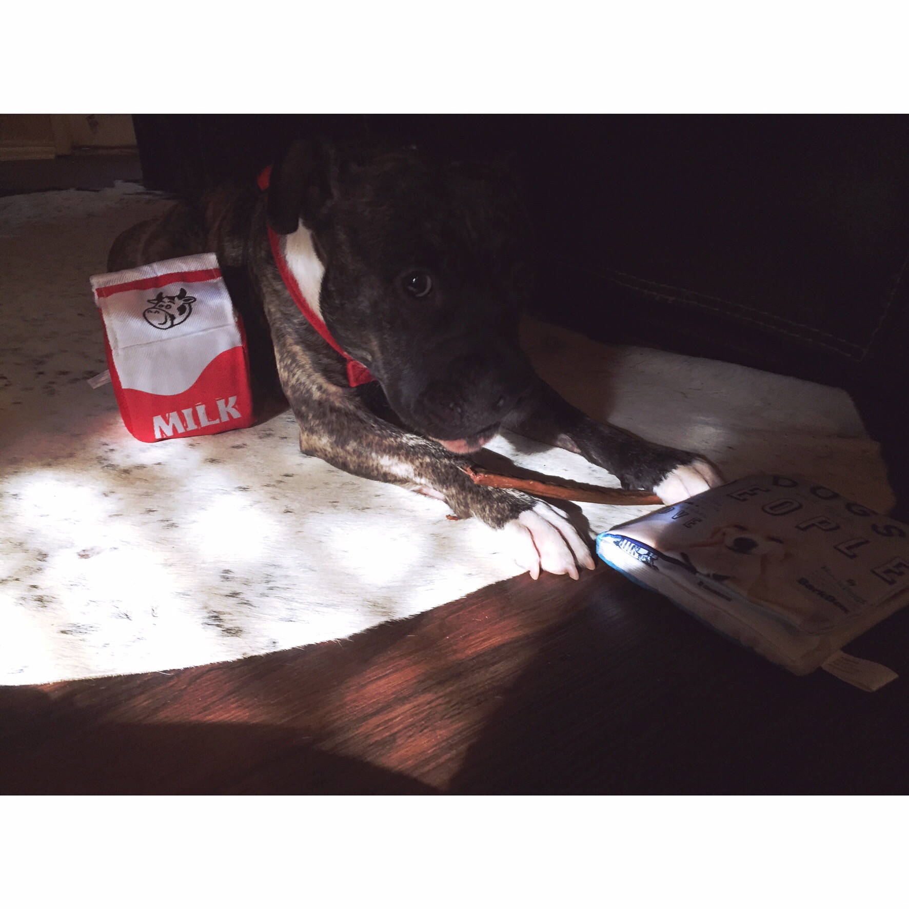 In our box we got two heavy duty chew toys disguised as an adorable milk carton and magazine (pictured below).